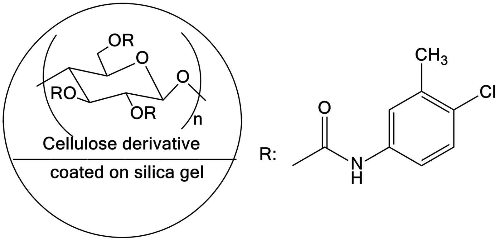 纤维素型是使用最广泛的手性柱之一,纤维素型手性色谱柱的分离作用包括相互吸引的作用及形成包埋复合物。它们属于Wainer分类中的第2种类型。市售的手性色谱柱为微晶三醋酸基、三安息香酸基、三苯基氨基酸盐纤维素固定相。很多化合物可通过此类型的色谱柱得到分离。这种类型的手性色谱柱种类也很齐全。流动相使用低极性溶剂,典型的流动相为异丙醇-正己烷混合物。这类柱子根据制作工艺,分为涂敷与键合两大类。但特别要注意由于氯可以使涂敷纤维素从硅胶上脱落,因此要确保涂敷类柱子流动相中无含氯溶剂。